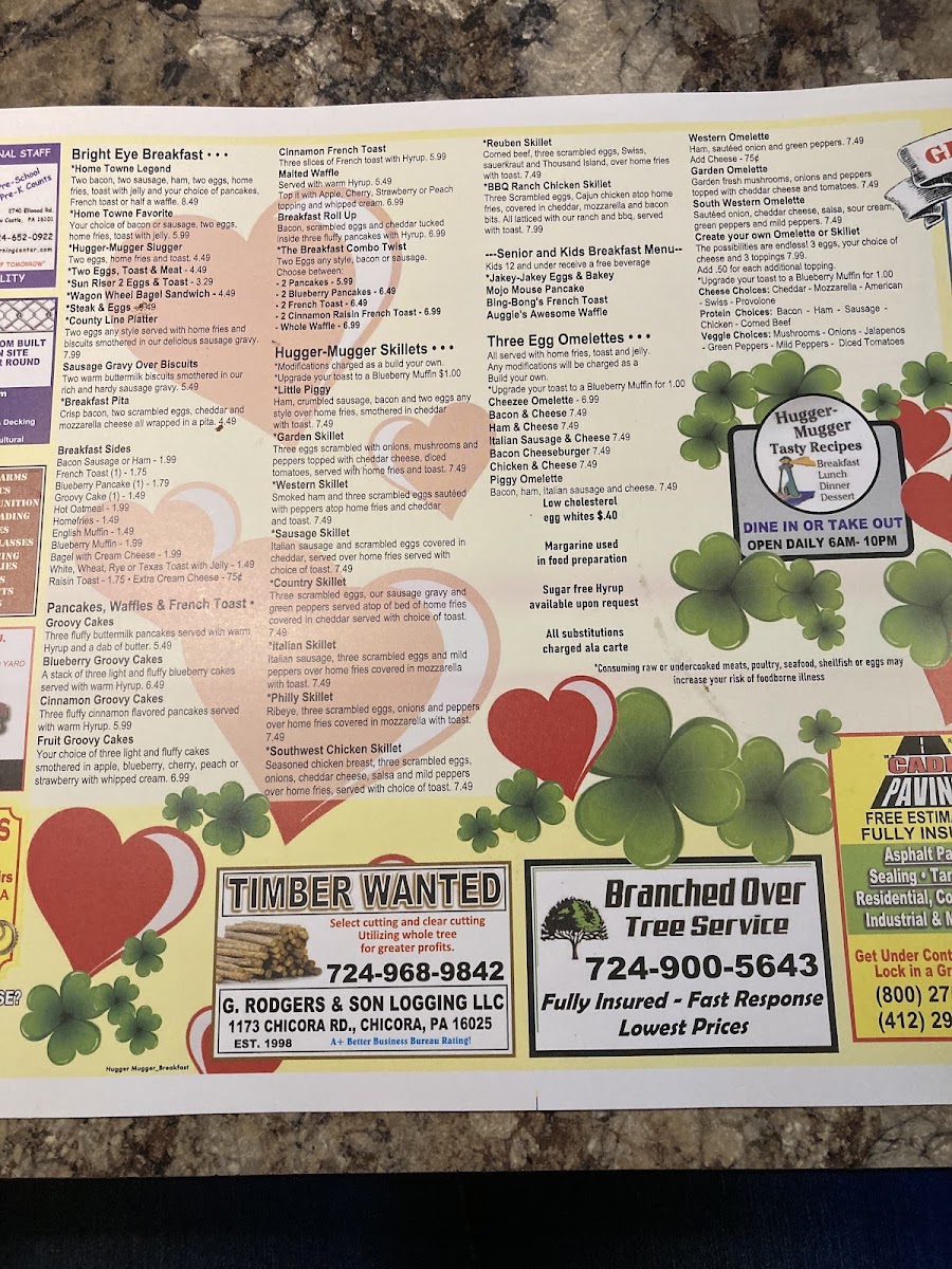 Welcome to Hugger-Mugger Tasty Recipes, nestled in the heart of New Castle, PA. This delightful eatery is where nostalgia meets flavor, offering a menu that will transport you back to your favorite family meals. With items like the tender Steak & Eggs and the hearty Home Towne Legend, breakfast here is a celebration of comfort food.